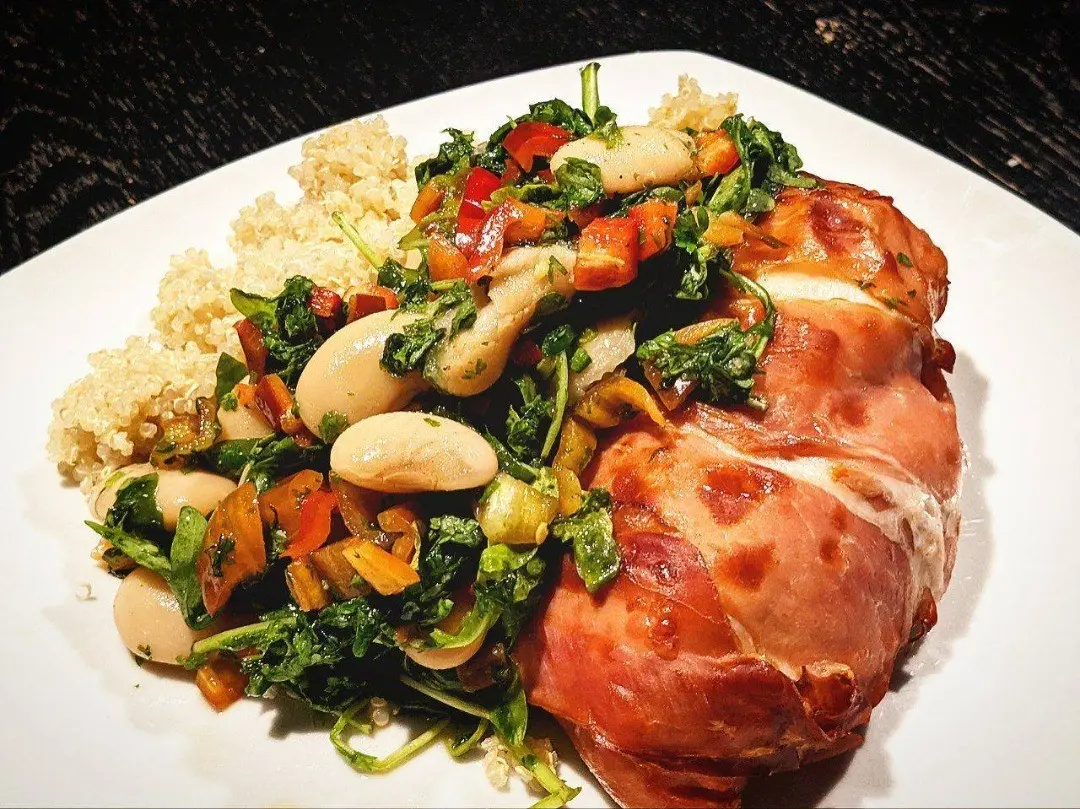 Kylling pakkaður inn í parmaskinku og við lekkrum salat afturvið