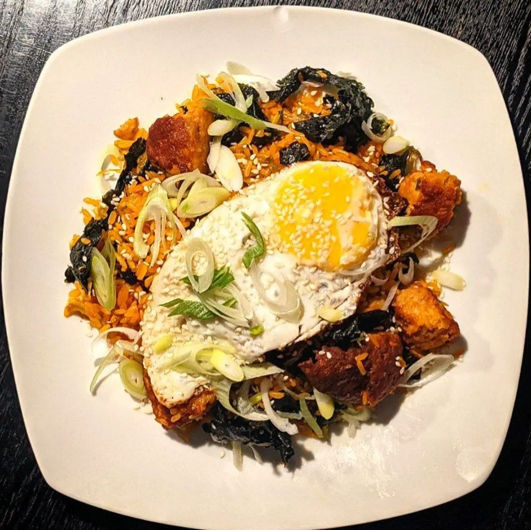 Koreanskur svína steikt rís, við lekkra gochujang og sushi nori