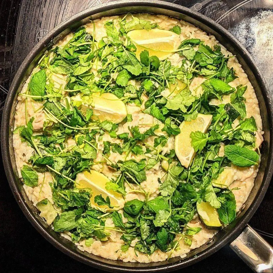 Tailendskt grønt kokus rís við kyllingi, í einari pannu