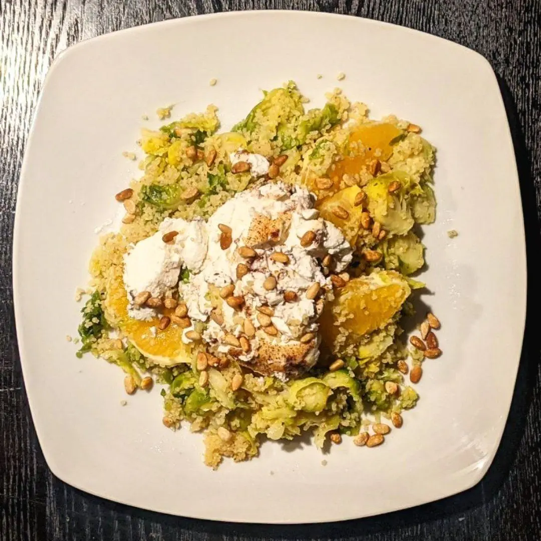 Krydda og bakað ricotta við rósukál, appelsin, og pinjukarna kuskus
