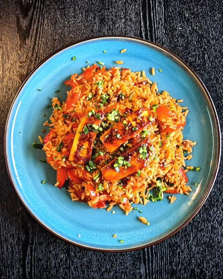 Hot Honey Halloumi with Red Pepper Fried Rice