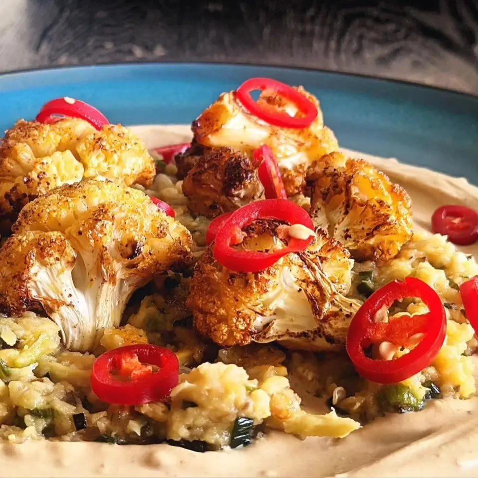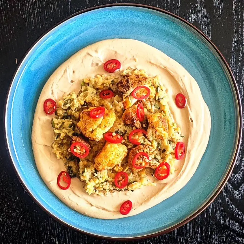 Chilli Roast Cauliflower on top of miso crème fraîche and the Holy Trinity (spring onions, garlic, and ginger)