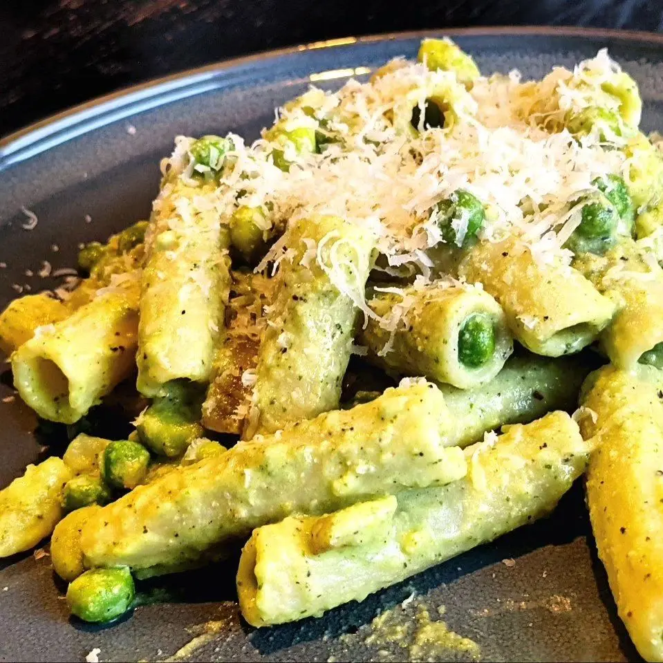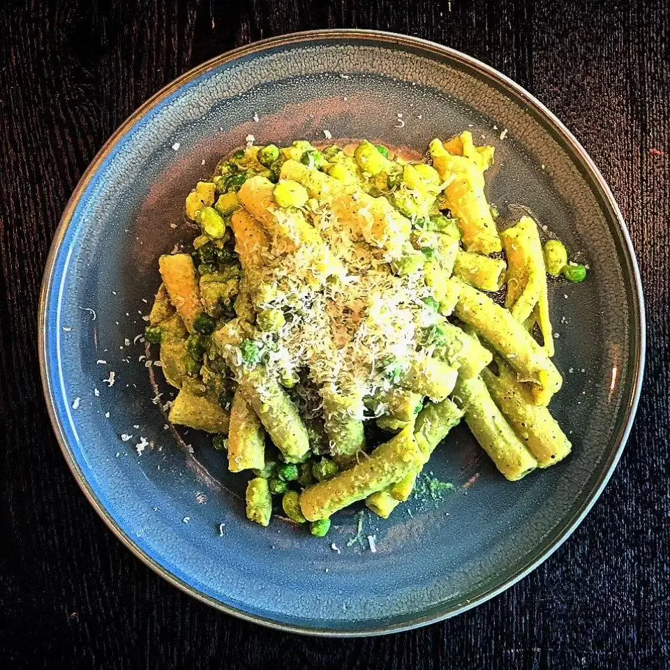 Pesto Pasta Primavera Heimagjørt pesto afturvið pasta, epli, og ertrar